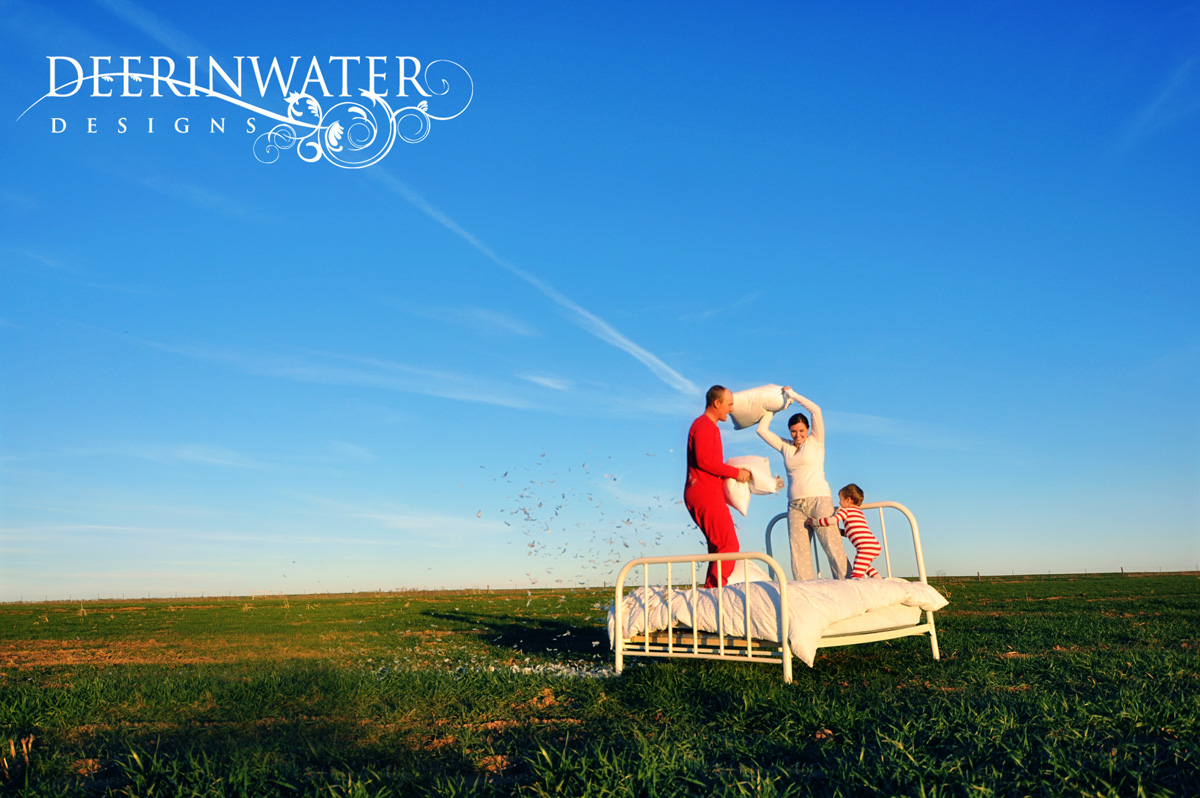 Meet the Weaver family...a fun family that was up for an adventure. Meegan is a fellow photographer friend of mine and when she called me a few weeks ago and asked me to take her photos I was so excited. She had such a great, fun idea and I was game! I am always excited to do something different. :) They had this old antique bed set up in this field and pajamas ready to go. Anyway, I started from the end of the shoot and then you will see some photos we took before the feathers went flying. Thanks Meegan for trusting me with your memories. You are a beautiful person inside and out!